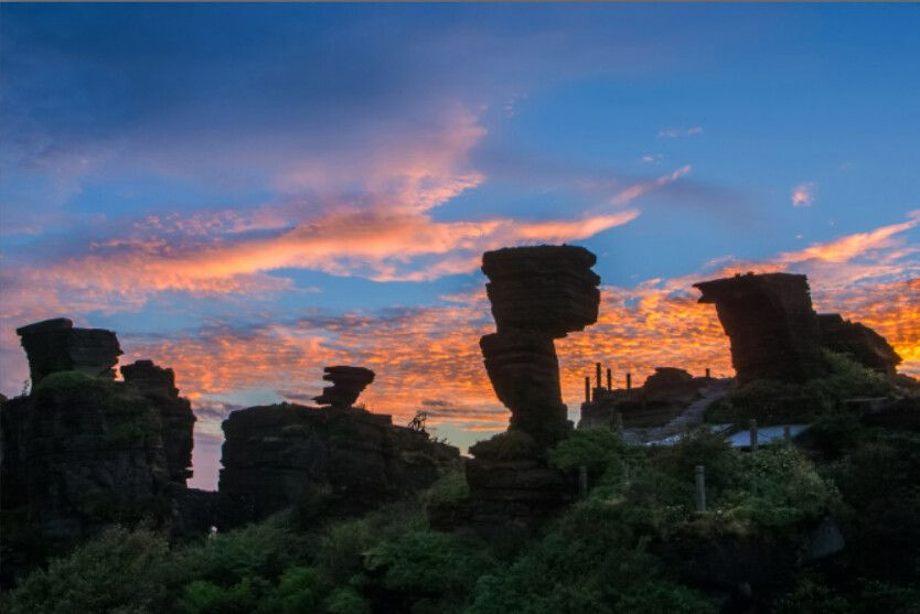原始洪荒是梵净山的景观特征,全境山势雄伟、层峦叠嶂,溪流纵横、飞瀑悬泻。其标志性景点有:红云金顶、月镜山、万米睡佛、蘑菇石、万卷经书、九龙池、凤凰山等。