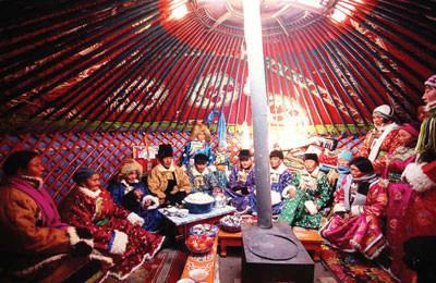 一到大年初一,就不分诺彦、老爷,头人、官吏,他们都要穿上最华丽的衣服,骑上最膘壮的骏马,到左邻右舍给亲朋好友、长辈熟人献上哈达,敬酒拜年。还要挨家逐户地走遍各个毡包,互相问好祝福。这是蒙古人从古老历史上传承下来的礼仪。