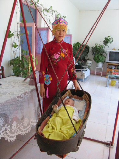 锡伯族的诞生礼在人生诸礼中占有重要位置,而且持续时间也比较长,包括产前的求子习俗、孕期习俗,以及分娩习俗和子女养育习俗。为庆贺孩子的出生,要为他(她)举行婴儿祝吉礼,主要包括起名礼、满月礼、周岁礼。男女新生儿的诞生仪式有所差异。传统观念认为生男是“弄璋”之喜,表示尊贵,要大庆贺;生女为“弄瓦”之喜,表示卑顺,仪式从简。