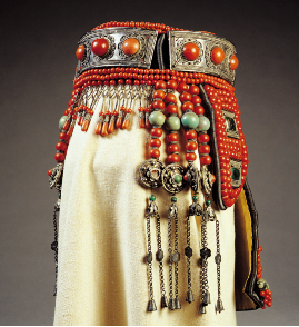 草原上,妇女们平时一般多罩头巾。头巾大约丈余长,颜色多种多样。质料有布、麻、绸、绢等。姑娘们喜欢将头巾缠在头上,然后在右侧挽一个小结,把头巾的穗头垂下来。已婚妇女们则用头巾包住头顶后,缠一圈,不留穗头。在庄重的场合还要戴上绣有丹凤朝阳、二龙戏珠等花纹图案的帽子。帽顶上有红色穗子和闪光明亮的帽顶宝石。传说这种习俗始于成吉思汗时期。当初成吉思汗统一蒙古各部落之后,下令每个人都要罩头巾,以表示头颅上飘有旌旗之角,希冀民族强大之精神常在。从结婚、告别姑娘生活的那天起,妇女们便开始佩戴雍容华贵的盛装首饰。而蒙古族的盛装头饰,以鄂尔多斯地区最为典型。这种头饰汉译为“头戴”,主要由“连垂”和“发套”两部分组成。不仅制作工艺精湛,而且多用数百颗珊瑚、数十条银链、珍珠串和许多银环、银片以及玛瑙、玉石等穿缀而成。装扮起来可谓珠帘垂面、琳琅满目。一副头戴一般都重达三四斤,有的可达十余斤。据说一副高档头戴,过去往往要用几群好马或数百峰好驼才能换取【图为清代鄂尔多斯珊瑚松石银牌链盛装头饰,中央民族大学民族博物馆馆藏】。
