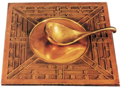 战国时期人们利用磁石指示南北的特性制成了指南工具——司南。但当时的司南究竟是什么样子,目前还无法考证。《中国历史》课本插图——“司南”是根据中国历史博物馆展品“汉代司南模型”绘制的。这个模型是后人根据史书记载以及出土的汉代地盘实物制成的。地盘由青铜制成,内圆外方,中心圆面磨得非常光滑,以保证勺体指示方向的准确性。中心圆外围依次布列八卦、天干、地支和二十八宿共计24个方位。地盘中心的小勺由整块的天然磁铁磨成。磁铁正极为磨成司南的长柄勺头,底部半球面也非常光滑。使用时先把地盘放平,再把司南放在地盘中间,用手拨动勺柄使它转动等到司南停下来,勺柄所指方向就是南方。这种勺形司南直到8世纪时仍在应用。