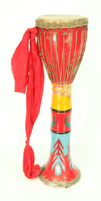 阿昌族的乐器主要有竹琴、洞箫、葫芦箫(右图,刘军摄)、三月箫、铜口弦、三弦、象脚鼓(下图,蒙哥提供)、铓锣等。葫芦箫是用葫芦连接三根竹管制成的,它有7个音,音量小,音调低缓圆润,一般晚上用。三月箫用一根竹管制成,也有7个音,它的音量大,音色细亮,多在白天使用。葫芦箫和三月箫不仅是阿昌族人民心爱的传统乐器,还是男女青年传情示爱的媒介。