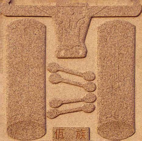 由木鼓、牛头图纹组成的图案,象征纯朴、纯洁、刚劲、丰衣足食。