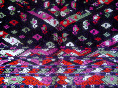 苗族织锦是我国传统织锦技艺中独具特色的一种,至今仍保有传统艺术风格和织造技术的产品。苗族织锦又称织花,是苗族妇女利用当地所产的蚕丝、苎麻、木棉等纤维染彩编织的花纹织物。苗族织锦有通经断纬法和通经通纬法两种,前者运用较为广泛,从东部苗族的湘西到西部苗族的楚雄一带都使用。其主要特点是:本色的经线比较细,彩色的纬线比较粗,以纬克经,只显示影纬而不露经线。彩色的纬线充分覆盖在织物表面,正面色彩非常艳丽,反面呈不规则状。