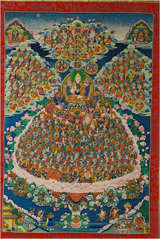 皈依是佛教的入教仪式,皈依境是藏传佛教僧侣信众在修持佛法时的皈依对象,其重心是观想上师、本尊、佛、法、僧、护法等六皈依处,统称为“皈依境”,各教派都有各自不同的皈依境。此唐卡所反映的是格鲁派的皈依境,它以格鲁派的开派祖师宗喀巴为观想的主尊,围绕着传承祖师、本尊、佛、菩萨、护法等组成基本画面。所描绘的是在一片清净辽阔、美丽富饶的草原上,有一个清澈湛蓝的湖泊,人们在湖畔莺歌燕舞、自娱自乐、祈求皈依。湖中央生长一棵枝叶扶疏,鲜花盛开如意树。独茎的树干像阳伞一样,分成五枝,一支在中央指上方,另外四支分别指向东南西北四方。各树枝围绕着的中央是一个由众狮子驮着的巨大曼陀罗。上师宗喀巴端坐在中央树枝宝座上,宝座上有莲花、日月轮,在他的头顶上垂直坐着格鲁派历代传承上师。中央曼陀罗从上往下共有13层,有本尊、诸佛、诸菩萨、护法等,包括以藏传佛教胜乐金刚、喜金刚、时轮金刚、密集金刚、大威德金刚五大本尊及金刚亥母、大悲胜海红观音等本尊,以释迦牟尼佛为主,周围有十方三世一切诸佛,有以四臂观音为主的八大菩萨和佛陀的弟子,有大黑袍金刚、四臂玛哈嘎拉、六臂玛哈嘎拉、吉祥天母等护法。在皈依树下方最下层是四大天王。在唐卡的左下角有一处人去楼空的房屋,代表出家,右下角为一位格鲁派法师敬献供品,代表正在修行。