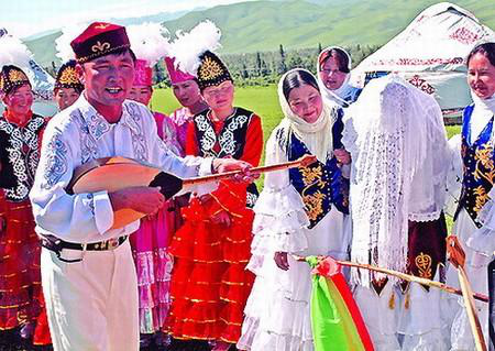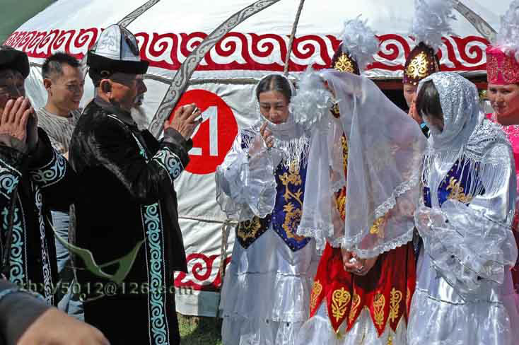迎娶仪式,新娘被送进公婆家门时,有一个胳膊上系各色布、手持嫩树枝的人,唱起了《揭面纱》歌,揭开新娘面纱,向众人介绍,向新娘劝诫、忠告。新娘向公婆等行礼,向炉火内倒油燃火,在座的人祝福新婚夫妇幸福,争相观看并嬉逗新娘。新婚夫妇合饮一碗由毛拉念过经的圣水,老人给新娘倒茶祝福。接着,新娘坐在刚宰羊剥下的羊皮上,含有生育顺利之意,一盘羊肉端上来,新娘先请公公、婆婆、长辈品尝,屈膝施礼,之后才能吃肉、喝茶。吃喝完,开始了各种娱乐活动,阿肯们弹起冬不拉,一边为新人祝福,一边歌唱新生活,一直唱到第二天破晓。婚礼期间要举行赛马、叼羊、姑娘追、阿肯弹唱等活动,能持续热闹两三天。
