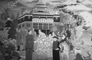 大型历史人物唐卡画卷《一代宗师——十世班禅》,是我国第一幅全面反映历代班禅尤其是十世班禅丰功伟绩的唐卡长卷。这幅作品由100多位唐卡画师历经3年创作完成,于2016年1月28日十世班禅大师圆寂27周年纪念日在西宁宏觉寺首展。图为该作品中1951年12月习仲勋在西宁宏觉寺为十世班禅大师赴藏送行的场景。