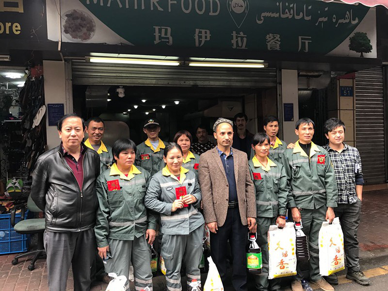 去年元旦期间,玛伊拉餐厅的全体员工在少数民族工作室的协助之下,邀请了辖区内10名环卫工人前来就餐。餐厅老板麦麦提伊敏·麦麦尼亚孜还出资给环卫工人送了米、油、红包等慰问品,共迎新春;凯维萨尔餐厅的老板阿布都西库尔则定期帮助越秀区光塔路社区的贫困户李珍妹一家,每个月都送去米面油等生活必需品或生活费等,帮她度过难关。