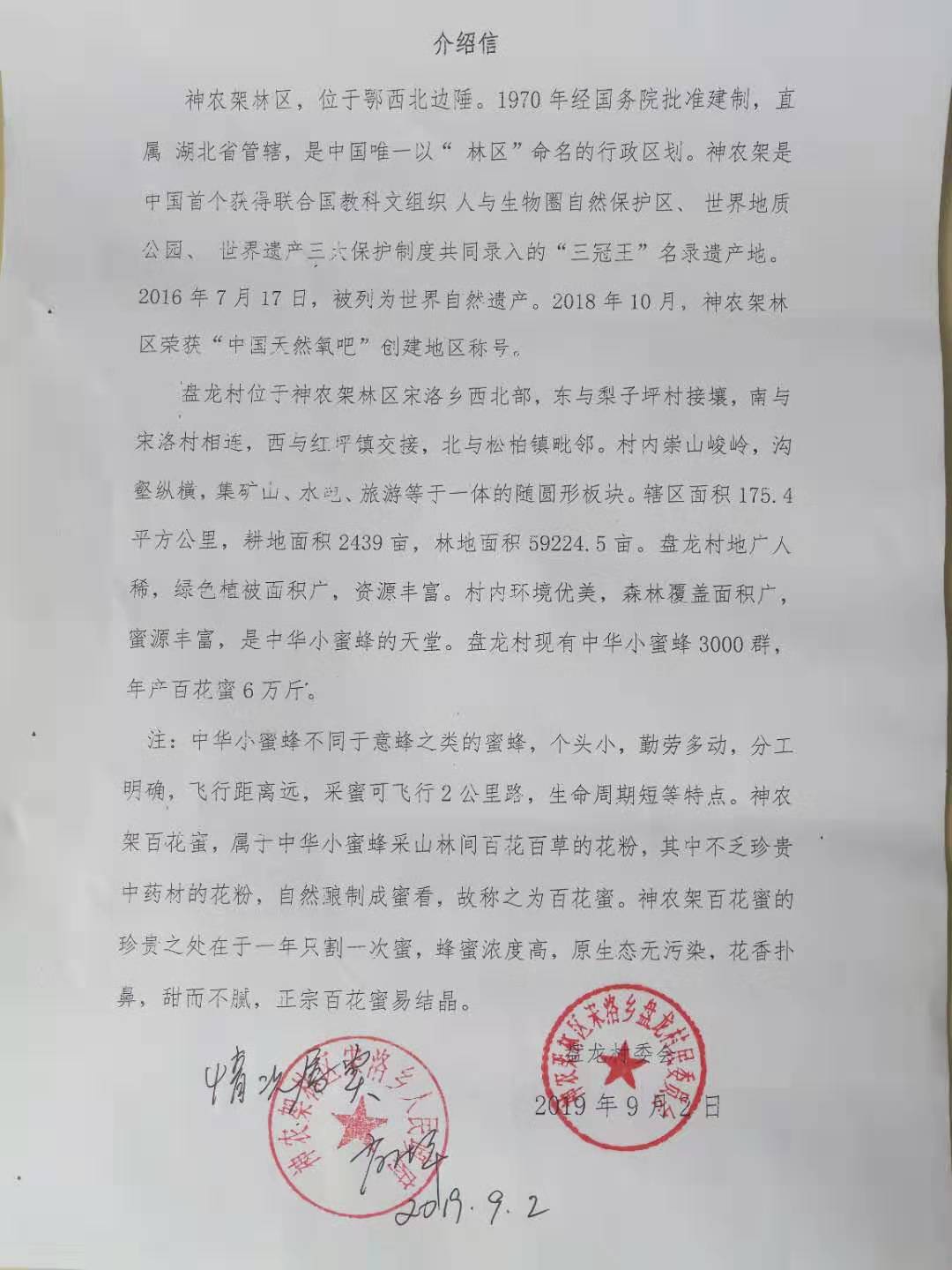神农架林区简称神农架,1970年经国务院批准建制,直属湖北省管辖,是中国唯一以“林区”命名的行政区划。神农架处于东经109°56′~110°58′,北纬31°15′~31°75′之间,位于鄂西北边陲,东接保康,西邻重庆巫山。神农架属于北亚热带季风气候区,为亚热带气候向温带气候过渡区域。夏季湿润多雨,冬季温和少雨。年降水量在800~2500毫米之间。而盘龙村隶属神龙架林区宋洛乡,靠近松柏镇、红坪镇和宋洛乡梨子坪村,面积176平方公里,人口1750人,主要有汉族、土家族等民族。盘龙村地广人稀,资源比较丰富。因为地处环境优美的林区,因此十分适合发展旅游业和生态农业,百花蜜便是其中一大特产。