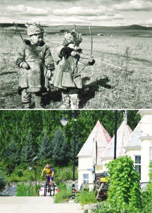 拼版照片:上图为两个鄂伦春儿童在玩射箭游戏。资料照片鄂伦春自治旗供图