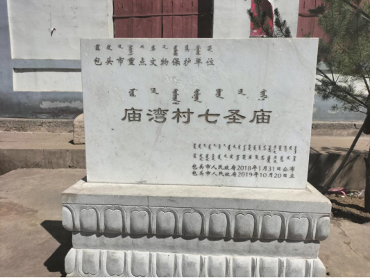 七圣庙于乾隆元年(1736年)由水涧沟门四湾村民出钱、出工、出车,萨拉齐商会众多善人居士出资建设。建成后的寺庙,东殿2.5间,供药王、观音,正殿四间供文财神、武财神、龙王,西殿2.5间供牛王、马王。在中国北方的寺庙中,很难找到七个偶像同居一庙,佛教与道教,众神(佛)与牛马位列一寺,共存共荣的寺庙。“文革”期间,主殿附属殿堂神像被毁、僧侣被驱、山门也被改建成供销社。