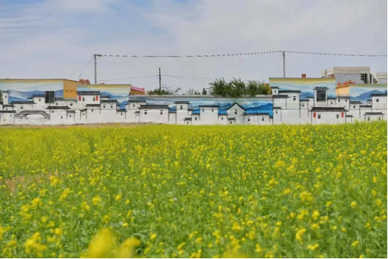 乡村的墙体彩绘和油菜花海。