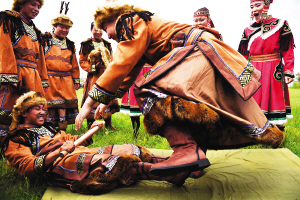 黑龙江省逊克县新鄂乡的鄂伦春族青年在古伦木沓节上进行传统体育项目拉杠展示。王建威摄
