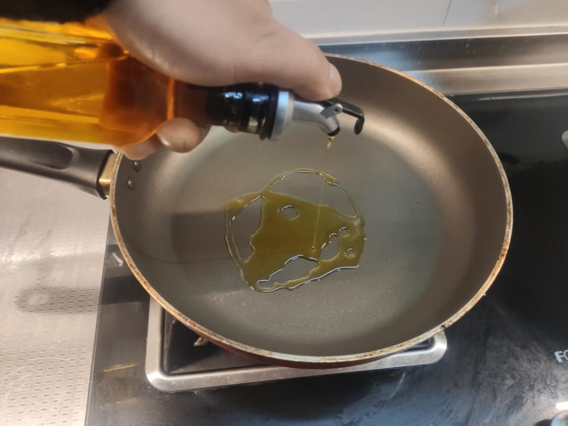 洋芋粑捏成形后,就正式进入烹饪阶段,选取平底的不粘锅,锅中放入少量的植物油。
