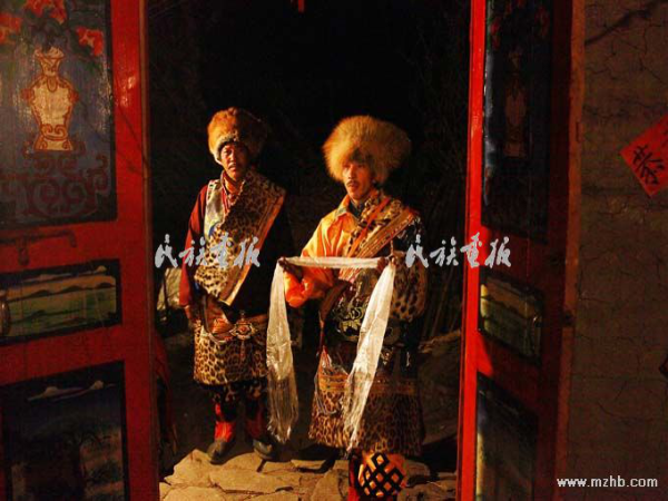 凌晨五点,新娘的舅舅推开了新娘家虚掩着的大门,手捧哈达用歌声开始了对女方家的赞美