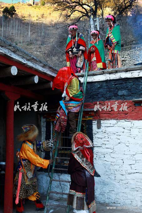 新娘进入婆家的路线是活佛确定的,遇墙翻越,遇水过河,不能更改。扎四满遵循此规越顶入户,好似自云端飘落婆家