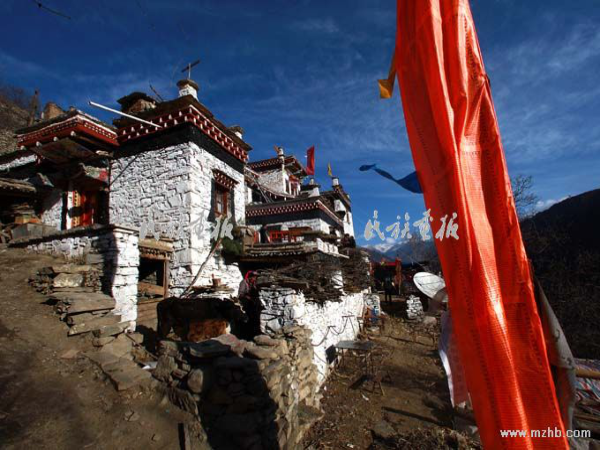 远处的白云雪山天天护佑着男方家雕房,今天这里刮起了喜庆的经幡