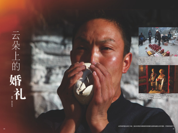 生活在群山之巅的嘉绒藏族对云彩有着独特的理解。在寨子里崎岖蜿蜒的小路上,在男女双方家中的庭院里,在待播的山坡地里,在房屋建筑的装饰图案里,处处都有用白灰、用白油漆描绘的云彩图案。宗教构建着他们的精神,神山圣水和洁白的云彩伴随着他们的生活,更映照着尼玛绒布和扎四满红晕幸福的脸庞。