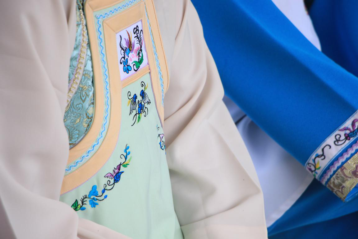 关口村的布依族文化保留还比较完好,基本上大家都还有本民族的服装,在节庆活动上都会穿着。妇女的服装就更加的好看,一般上装着青布衣裳,胸前围的这个肚兜会用绸缎做花边绣上各种图案,靠一个布带打了活结系于背后。裤子一般为直筒,裤口宽八九寸。