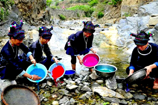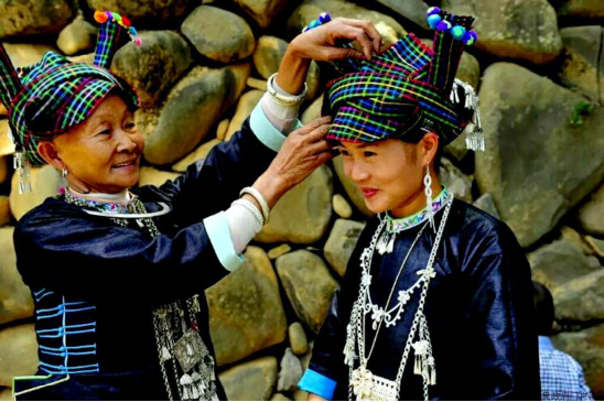 下者偏村民服饰所用的布料都是他们自己织染制成的土布。而颜色上不外乎有黑、蓝、青、白四种颜色,颜色是以蓝靛、蛇藤汁等植物原料混合印染,具有不褪色、不怕粘泥的特点。自纺、自织、自缝制的壮族女子的服装要么蓝黑,要么蓝色。节日盛装穿上斜襟翘角上衣和百褶长裙,一般的上衣是左衽无领阑干衣,腰部扎有紧身带,下身穿长裤,裤外套短裙,经常把短裙的前边撩起塞进腰部紧身带,脚踩绣花鞋,发髻、耳垂、脖颈佩戴精美银饰;包头帕有角,称牛角头帕,平日女子的头上包着彩色印花或提花毛巾装饰。男子穿对襟上衣,纽扣以布结之或者扎蓝黑头巾。村落拥有众多的民族特色文化资源,村里除了每年都举行别具特色的节庆、祭祀等活动外,还保存着最原始的“龙姐娜”(手巾舞)、“弄娅歪”(水牛(母)神之舞)、铜鼓舞、婚丧嫁娶等一系列民俗活动;壮语称“拢宁董”“拢阿曰”“拢拉”“拢京那”等。“赶花街”最为热闹的在者兔街和者偏村。节日前一天,各壮族村寨要举行一年一度的祭“者”活动。“者”是壮族的神灵,包括寨神、山神、土地神、植物神、雨水神等。一大早,村民们就杀猪宰鸭祭献“者”,祈求新的一年六畜兴旺、五谷丰登、全家平安;祭祀的时候,人人都庄重肃穆,心诚敬意。3天的节日活动期间,青年男女都会邀约亲朋好友背着盛满花糯米饭的精制竹箩、绣花挎包,带着事先准备好的毛边布鞋、绣花鞋垫、自制土衣、头帕、花线、项链等赠送情人的礼物,走向冲破包办婚姻的枷锁,争取自由恋爱、自由择偶的“情人节”。