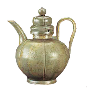 葫芦形钮盖, 盖壁有二孔。花瓣形直口,瓜棱状圆腹,矮圈足,直流,曲把。器底刻“永”字,有长条形烧痕。薄胎致密,釉色青灰。划花,盖饰云纹或羽纹,把上饰花草纹,身两面饰四对人物坐饮图。流云、酒搏、果盘等杂置其间。