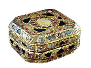 嵌宝石鎏金包银漆盒采用了银衬多宝嵌技术,盒内部为黑色漆木胎,外包鎏金银片,在银片上或者银片镂空部位镶嵌各种玉、宝石、松石、水晶组成精美的图案,制作复杂,工艺精湛。银衬多宝嵌是银衬技术与多宝镶嵌技术结合的工艺。银衬是一种将银片直接锤揲在漆胎外的工艺,起到固定、美观的作用;多宝嵌即集玉石、象牙、玳瑁、云母、金银等宝物为一器的工艺。