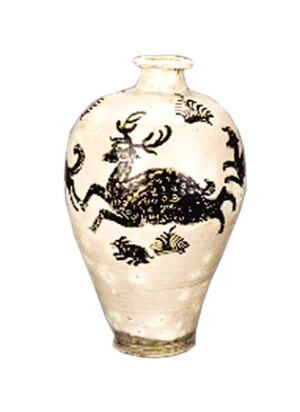 梅瓶为圆唇,小口,平折沿,短细颈,鼓肩,肩部以下斜向内收,圈足底。器身除底部外均施白釉,瓶体上用黑彩绘制图案。图案共有5只动物,分别为梅花鹿、羊、两条狗和兔子。鹿、羊、狗等体型较大的4只动物均匀分布在梅瓶的四周,两只狗位置相对,中间有鹿和羊相隔,形成狗逐鹿和狗撵羊的场景。兔子位于梅花鹿的下方。在动物上方和下方还绘有草叶纹图案。图案构成一幅草原上狩猎的场景,画面饱满,生动传神。