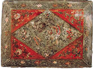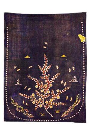 图案中心为一梅独放,枝干下白上红,有14朵五瓣梅花,其余均作花蕾状。大干铺绣,小枝锁绣,两边有花草两簇,14只蜂蝶围绕树边。远方有或蓝或黄云状山4处,左右下方由白色联珠圈勾。