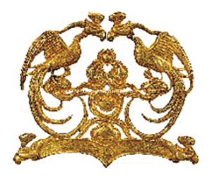 鎏金薄银片制成。镂空双凤相对,立于如意云纹上。立凤勾喙长颈,芝冠长鬃,翅振而尾卷,双凤之间为四重如意云纹。下部横梁中间錾刻缠枝花叶,左右对称,边缘连珠,两端为芝冠凤首。