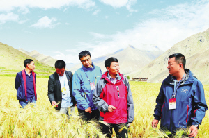 黑龙江省第六批援藏工作队队员考察青稞增产试验田。黑龙江省第六批援藏工作队供图