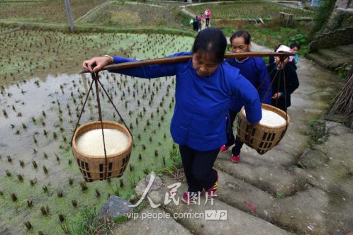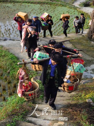 11月17日,新娘家的亲戚朋友挑着贺礼前往新娘家庆贺。