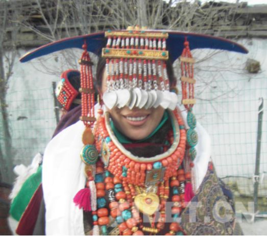 头饰是普兰飞天服饰的重要组成部分,一般由绿松石和珊瑚点缀,一个做成的飞天头饰没有几万元是买不下来的。当然,那些镶嵌其上的宝石决定了其价格的高低。普兰市场中有一些尼泊尔商人专门制作那种头饰,然后静等当地群众来选购。