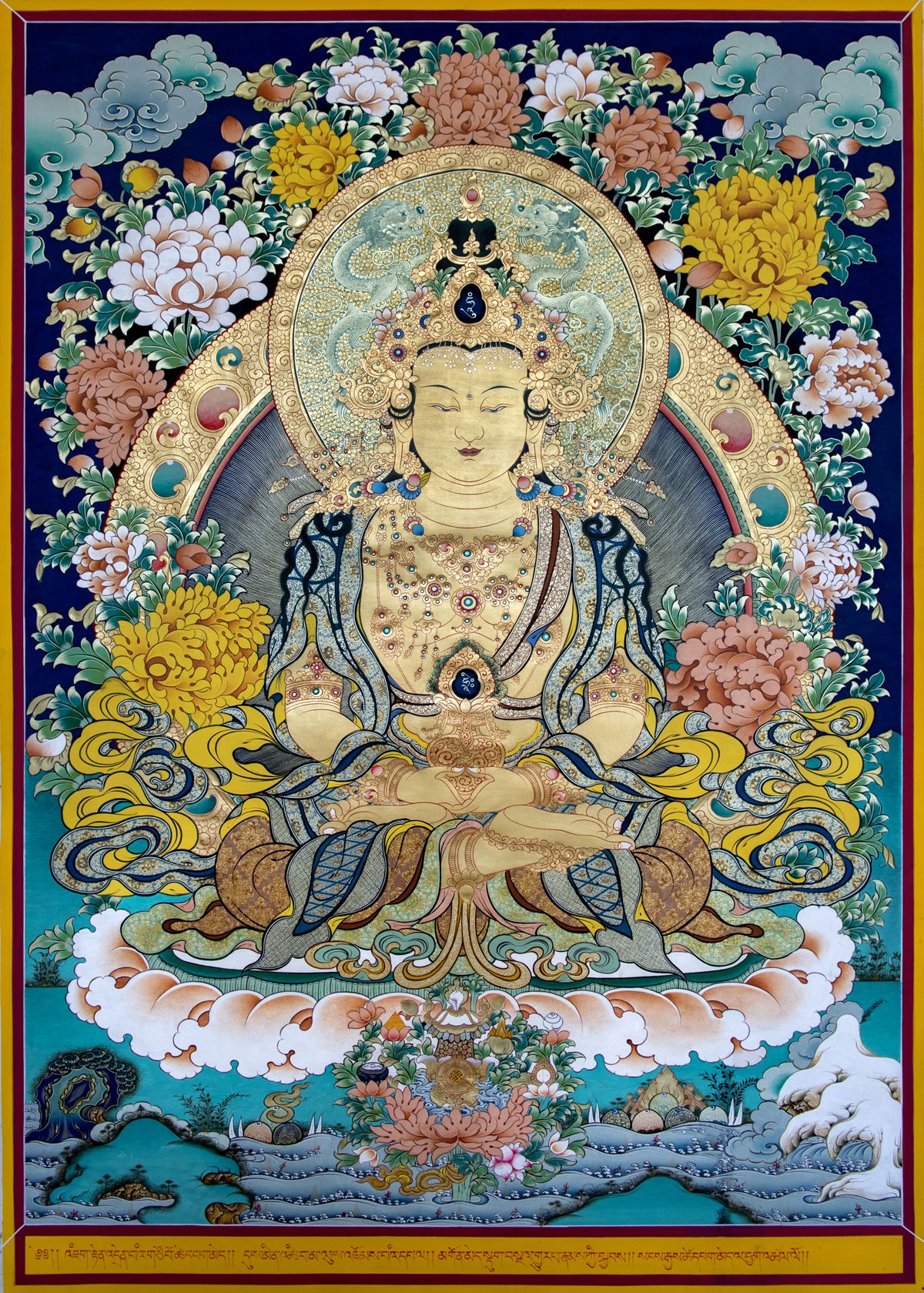 长寿佛(梵名Aparimita āyur jnāna su-vinisˊicita tejo rājāya tathāgata),在汉译佛经中无其形象之记载描述,藏传佛教中其画像为一面二臂,肌肤红色,盘发成髻戴五佛宝冠,上穿天衣,下著绸裙,身佩珍宝璎珞,具足一切报身佛的种种庄严,双手结禅定印于膝上,托长寿宝瓶,双足以金刚双跏趺安住于莲花月轮上。