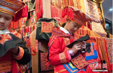 12月6日,在中国瑶族之乡广西金秀瑶族自治县的盘王节上,当地瑶族百姓展示瑶族织绣