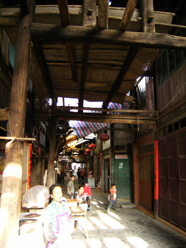 庆阳古镇是一条全木结构建筑的凉亭直街,全长100米,宽3米,建筑面积大约2000平方米,小街西北走向,沿街两面全是木质结构的商业店铺,有电器行、日用生活品店铺、肉市、农用物资行、茶行、食品行、药店、理发店、医疗卫生所以及十分古老的庆阳旅社。用句通俗的话说,这条街全是做生意的。全镇400多人,其中非农业人口120人。古镇现在每月有9个赶集日,商品除了日用生产生活用品,主要是本地的土特产品茶叶、花生、桐油等。古镇很紧凑,完整的一条街,周边没有多余的建筑,沥青公路从镇背后的山坡上经过,一条清溪绕古镇脚下流淌。镇上最大的企业,也是最喧闹的茶叶加工厂已搬到小溪对面,所以古镇显得十分安静,安静得像一个坐在溪边晒太阳的老人。