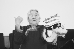 老人展示她制作的鄂伦春族传统皮帽。