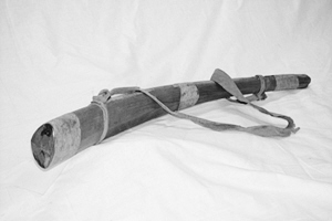 这只红松木质地的鹿哨呈牛角形,中间镂空,以细鳞鱼皮熬胶粘合,头部细,尾部粗,呈喇叭状;在头、尾、中间箍三道箍,在接近头尾的两端缠细皮绳为环,环上系宽皮带,便于出猎时背挎于肩或平时悬挂。它在现存同类器物中制作时间较早,源流、传承清晰。在它质朴的外表下,集中体现了北方狩猎民族的生活经验、创造智慧以及审美观念。