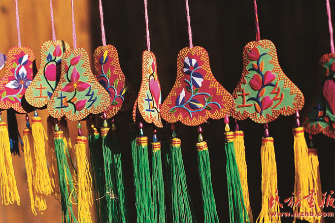 土族盘绣为当地妇女带来了不少经济收入。图为线条流畅、层次丰富、撞色奔放、针脚细腻的土族盘绣荷包(祁春英 摄影)
