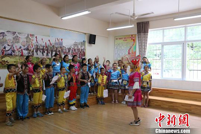 广西“山歌王”陆连芳给孩子们上课( 林馨 摄影)