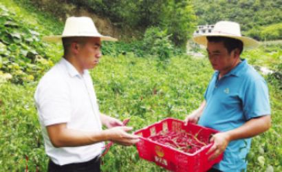 石通佾(左)与场河村村民石佩发(右)交流辣椒收成情况。马永摄