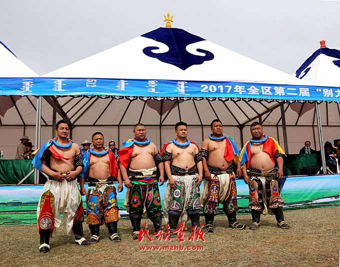 巴音昌呼格草原举行。图为被授予“将嘎”(彩带)的鄂尔多斯搏克们