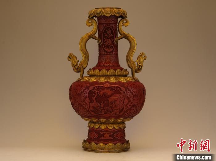 沈阳故宫博物馆敬典阁馆藏珍宝展展厅展出的乾隆款剔红开光山水人物纹龙耳瓶。 沈阳故宫博物馆供图