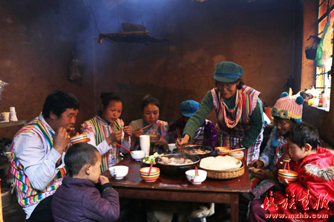 独龙族文面女太恰一家在吃团圆饭(余金成 摄影)