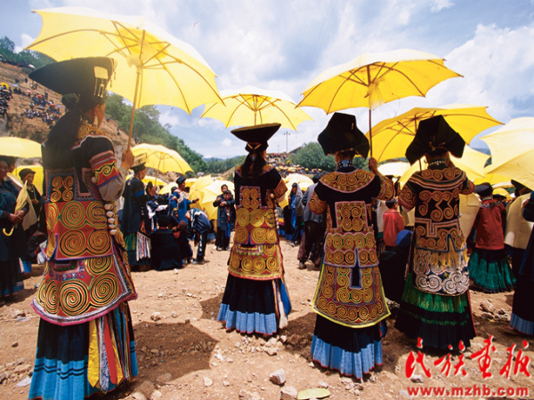 四川凉山彝族妇女的衣裙上绣满黄色花朵