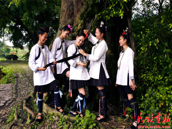 夏天,侗族妇女脱下蓝黑色的亮布上衣,换上凉爽的白衫