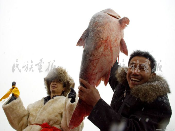 “祭湖”结束后, “鱼把头”带领几位渔工在刚才祭湖的冰面上,用冰镩凿开一个1米左右的冰洞,“鱼把头”拿着抄捞子,在冰洞里搅和几下,使劲往上一扬,只见一条活蹦乱跳的胖头鱼就被 捞出水面。经过磅秤,重32斤,称为“开湖头鱼”。经过几轮叫卖,这条“头鱼”以人 民币8888元的价格被一位广东来的游客买走。