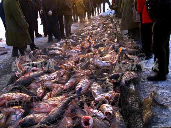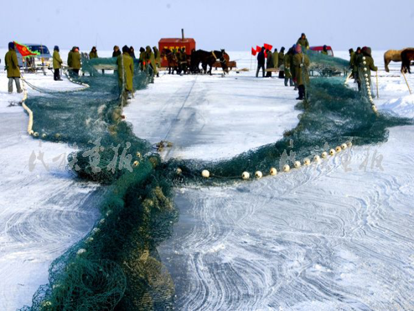 随着“鱼把头”高亢的号子,马拉人拽,一张几千米长的大网,被缓缓地拉出冰面。鲤鱼、鲫鱼、鲢鱼、鲶鱼等各种鱼类一群一群翻上了冰眼。转眼之间,冰面上堆起了一个个鱼垛。