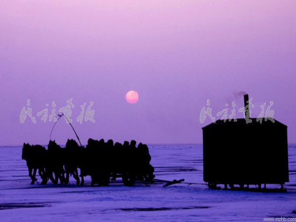 不知不觉,夕阳垂近在远处的冰面,夜幕降临了。游客、鱼贩、渔工跟着运鱼的马爬犁渐渐离去。迎着晚霞,我们也恋恋不舍地离开了查干湖……