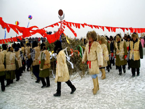 拍卖结束后,“鱼把头”把所有渔工都召集到马爬犁前,高喊:“上奶干、炒米, 给咱进湖开网的添饱肚子了!”这时,身穿蒙古袍的姑娘每人手托奶干、炒米的托盘走 到渔工面前,“鱼把头”给每位渔工端起一碗。