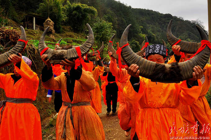 “黄袍锦衣”的寨老手捧牛角带领族人前去“跳洞”,他们一边走、一边举行祭仪